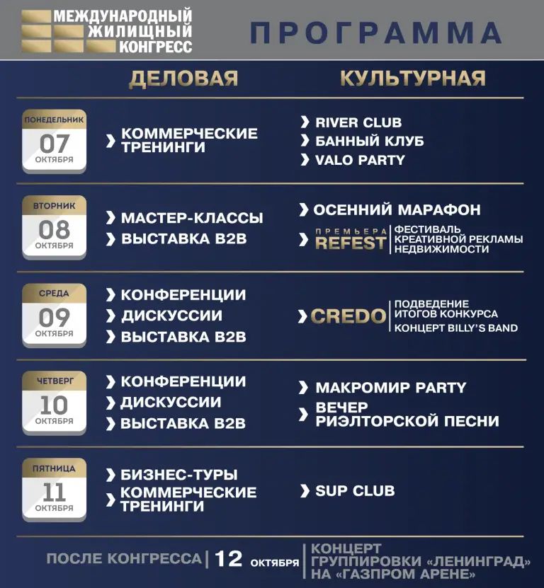 Он состоится с 7 по 11 октября в отеле «Парк Инн Прибалтийская» и соберет около 4 000 профессионалов рынка недвижимости со всех регионов России, а также 40 стран ближнего и дальнего зарубежья. Пройдет порядка 400 мероприятий, на которых прозвучат около 500 докладов.