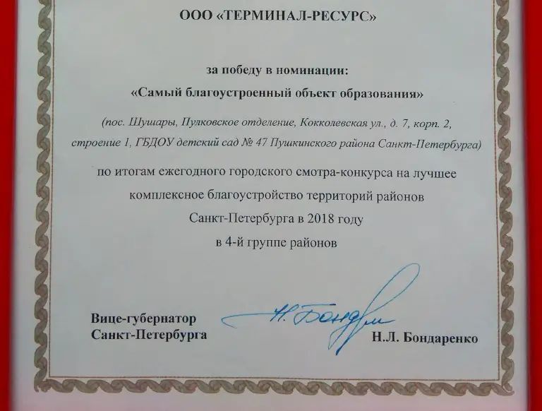 «Самым благоустроенным объектом образования» признан детский сад № 47 по адресу: пос. Шушары, ул. Кокколевская, д. 7, корпус 2, строение 1. Дошкольное образовательное учреждение построено компанией ООО «Терминал-Ресурс» в 2018 году. Современный детский сад с бассейном принял 140 маленьких пушкинцев, проживающих в малоэтажных жилых комплексах по соседству. Застройщик ведёт комплексное освоение территории на площади 316 га. Уже введены в эксплуатацию четыре первых «Образцовых кварталах», готовятся к сдаче с опережением графика ЖК «Образцовый квартал 5» и «Образцовый квартал 6».