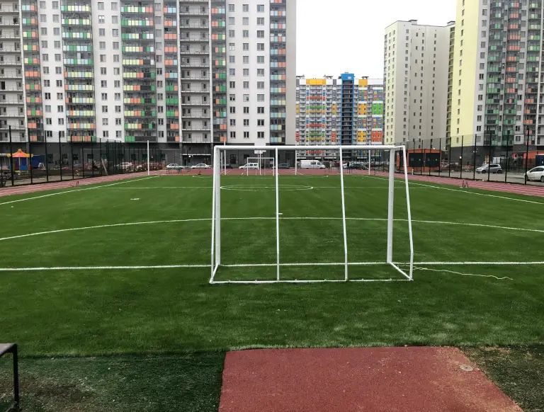 Работы по благоустройству территории выполнены на 90%. Смонтировано футбольное поле, баскетбольная площадка, беговые дорожки, продолжается устройство асфальтовых дорожек.