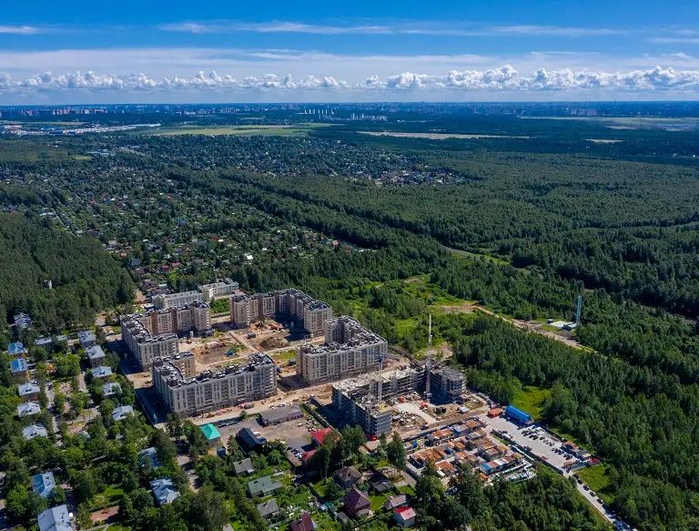 В ЖК всего пять домов (это более 1,5 тыс. квартир). Четыре корпуса из пяти будут введены в эксплуатацию в этом году. В них уже закончены фасадные работы, сейчас ведется отделка квартир и дизайнерская отделка парадных, стилизованная под фрагменты карельского леса. Стены декорируются видами побережья Финского залива и цитатами авторов, которые творили в Курортном районе.