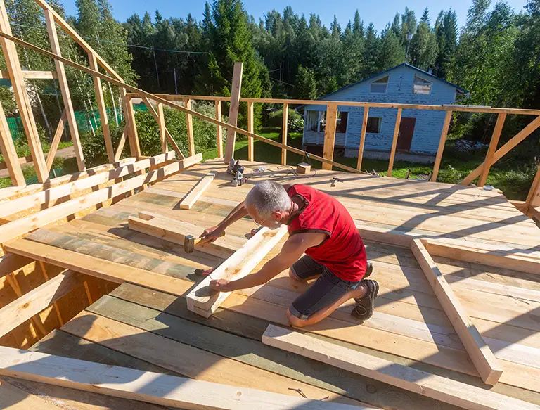 Оставшиеся 60% – это бесконечное перетаскивание и перекладывание крупногабаритных тяжестей (лесов, бруса, досок, плит OSB и т. п.).