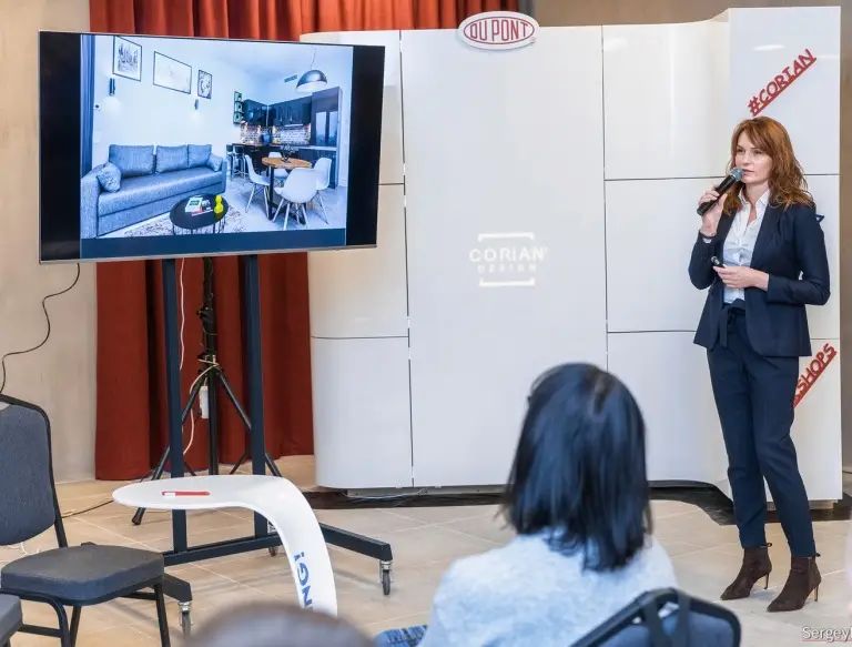 Неизгладимое впечатление произвели на аудиторию Даниил Гвоздов, директор представительства Corian Design и Екатерина Зайцева, руководитель отдела продаж HPL, SLOTEX.