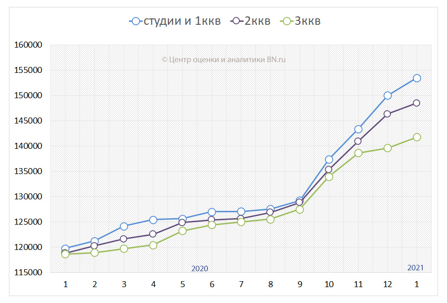 По нашим оценкам, цены в 2021-м будут расти плавно – на 1-2% в месяц, как это было в предыдущие годы, когда рынок находился в сбалансированном состоянии. Возможна чуть большая динамика в весенний сезон, накануне завершения действия программы субсидированной ипотеки.