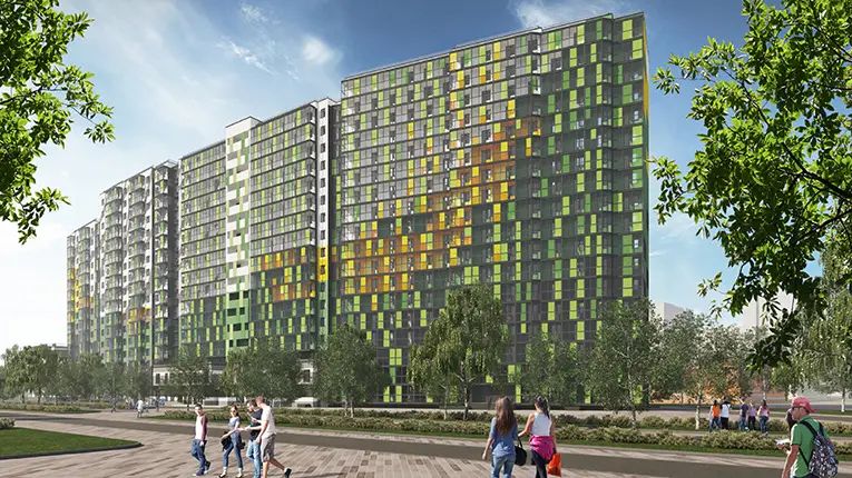 В продажу вышла первая очередь – квартал «Жар-Птица» – это три дома почти на 800 квартир, в том числе с французскими балконами и террасами. Сдача в эксплуатацию – второй квартал 2023 года.