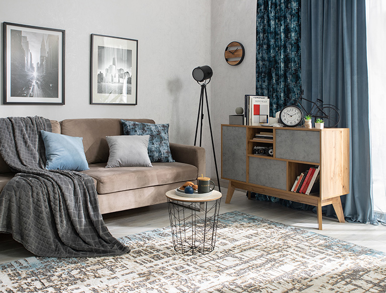Ту же функцию выполняют привычные атрибуты домашнего интерьера, напоминающие о том, что в этом пространстве живут, а не работают. Это шторы на окнах, декоративные подушки, пледы, покрывала и ковры. Их может быть сколько угодно, при условии что они выдержаны в той же серо-синей индустриально-космической гамме. В дизайне текстиля стоит избегать слишком ярких, контрастных рисунков: всё должно выглядеть так, словно подушки, покрывала и ковры провели несколько десятков лет на другой планете.