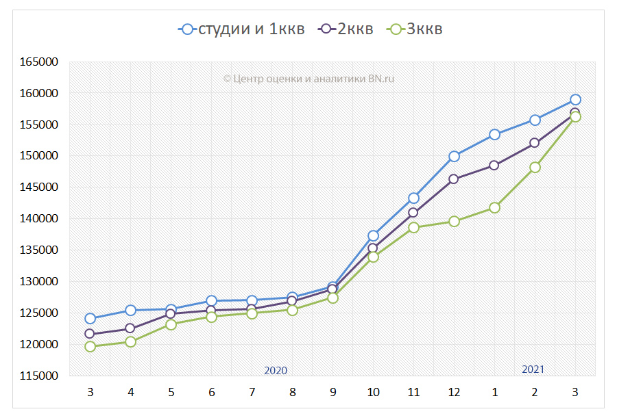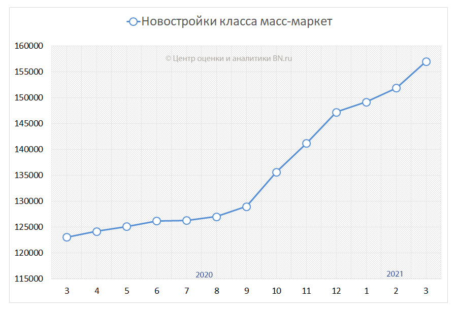 – По данным Центра оценки и аналитики BN.ru, за первый квартал 2021 года средняя цена предложения петербургских новостроек класса масс-маркет (без учета пригородов) выросла на 6,64%, или 9774 руб. за кв. м. И к началу апреля составила 157 тыс. руб. за кв. м.