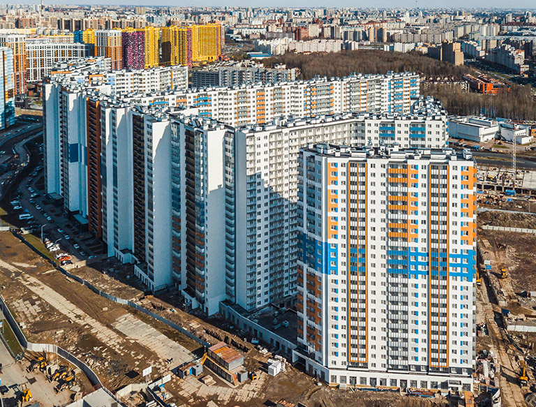 Внутри домов продолжается монтаж лифтов (50%) и систем отопления (40%), предчистовая отделка квартир (30%), установка внутренних и наружных дверей (20%).