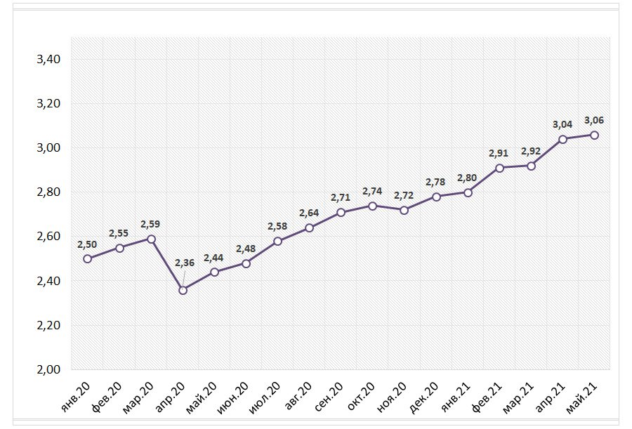 Уточним: по данным Национального бюро кредитных историй (НБКИ), в мае 2021 года средний размер выданных ипотечных кредитов в РФ составил 3,06 млн руб. (диаграмма 1). «Более года средний чек ипотечного кредита растет непрерывно. После сокращения весной 2020 года в дальнейшем он не только вернулся к допандемийному уровню, но и превысил его», – рассказывает генеральный директор НБКИ Александр Викулин.