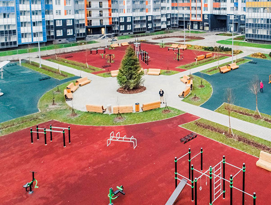 В номинации «Лучшее дворовое пространство» представлен ЖК «Полис на Комендантском», где все подчинено экоидеям. Архитектура двора включает несколько зон для активного и спокойного отдыха взрослых и детей. Во дворе установлены тренажеры для уличного фитнеса. Оборудование выполнено из качественных материалов и подобрано таким образом, чтобы жильцы могли выполнять полноценную тренировку на улице. Созданы все условия для активного детства: безопасный детский веревочный парк, игровые комплексы для детей разных возрастов, выполненные из экологичного, прочного и безопасного дерева робиния по индивидуальному проекту. Во дворе разбит собственный эко парк со всесезонными деревьями, высажены декоративные ели, что позволило сделать внутреннее пространство двора максимально зеленым. Все зоны органично соединены пешеходными дорожками для прогулок, а 7-этажный паркинг расположен так, что защищает двор от уличного шума и пыли.