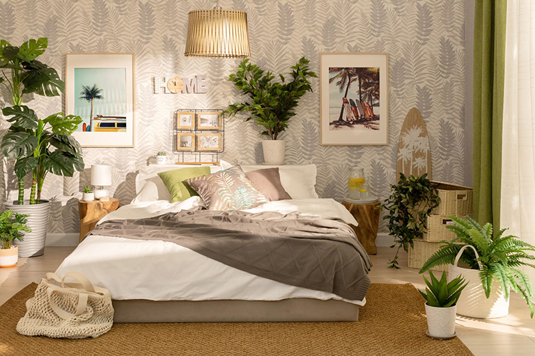 Для интерьера в качестве базового цвета стоит выбирать светло-бежевые оттенки, но чтобы пространство не казалось скучным, нужно добавлять насыщенные цвета на больших поверхностях. Если не готовы на акцентную зеленую стену, то используйте этот цвет в текстиле – например, в шторах, подушках и пледах.