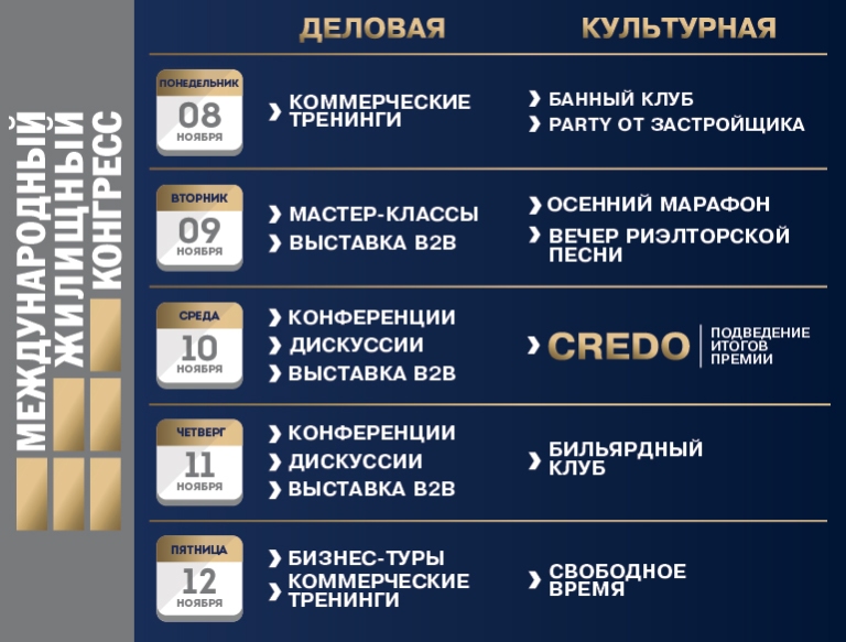 - Участников Конгресса также ждёт насыщенная культурная программа. Состоится подведение итогов Национальной премии в сфере недвижимости CREDO-2021, премьерный показ новой коллекции Международного фестиваля креативной рекламы ReFest. Пройдут многочисленные клубы по интересам и другие развлекательные мероприятия.