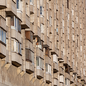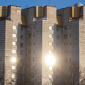По советским меркам это дома повышенной комфортности с массивными кирпичными стенами и брутальной фасадной отделкой – бетонными блоками и вставками из цветного металла под крышей.