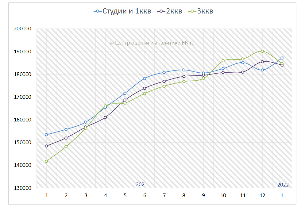 По данным Центра оценки и аналитики BN.ru, за январь 2022 года средняя цена предложения петербургских новостроек (без учета элит-класса) выросла на 0,5%, или 913 руб. за кв. м. И к началу февраля составила 186,1 тыс. руб. за кв. м.