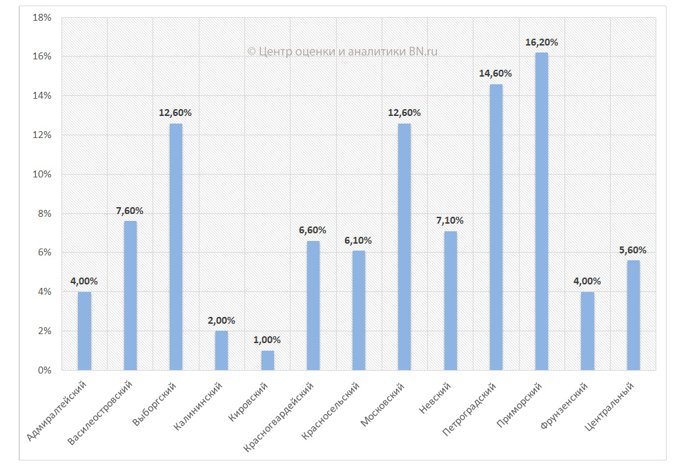 В структуре предложения по районам лидирующую позицию занимает Приморский – 16,2% от всего объема рынка новостроек Петербурга. Минимальное количество строительных объектов наблюдается в Кировском районе – всего 1,0%.