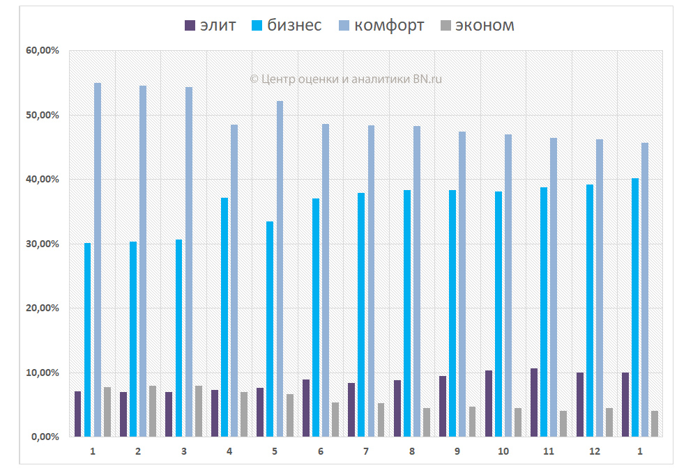 Новостройки комфорт-класса по-прежнему занимает большую часть рынка, их доля составила 45,7% от общего количества строительных объектов. Доля эконом-класса – на уровне 4,0%, строящиеся дома бизнес-класса – это 40,2%, элит-класса – 10,1% от всего рынка.