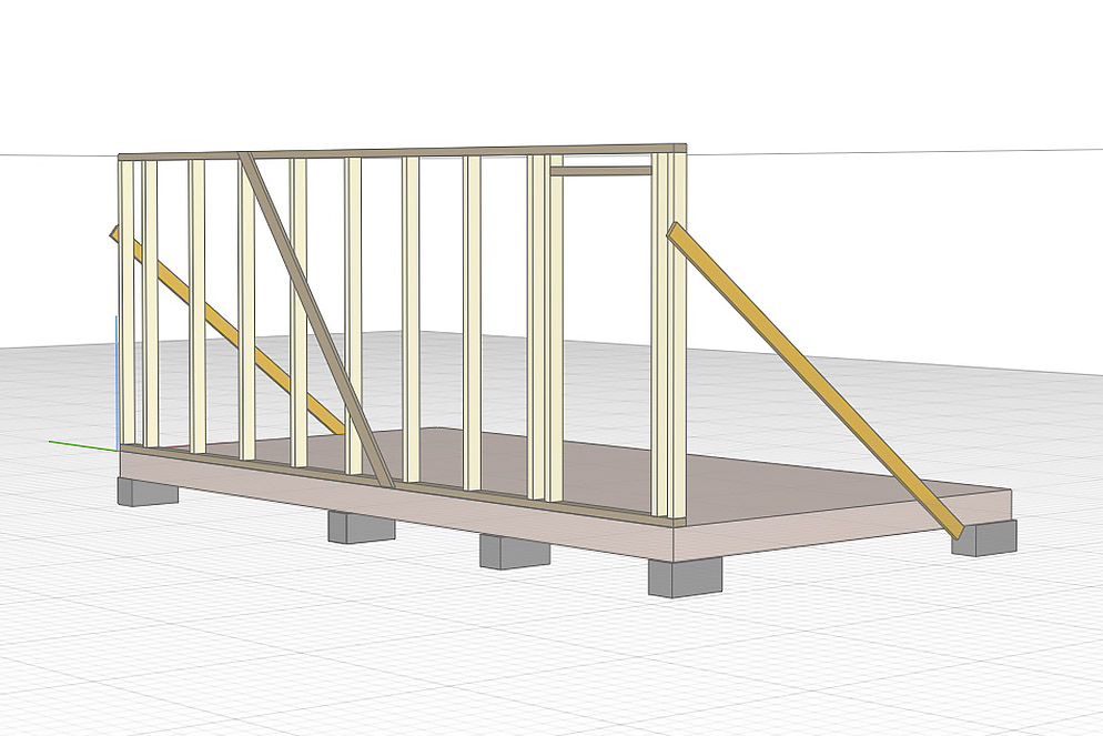 Затем вместе с помощником поднимаем стенку в вертикальное положение и укрепляем временными подпорками.