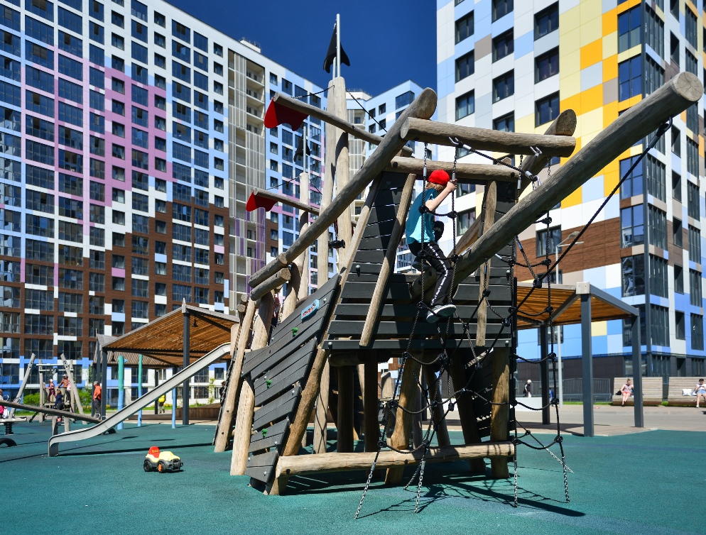 Отдельная тема благоустройства – инфраструктура детских и спортивных площадок. Здесь также особый подход, далекий от типовых решений. Во всех дворах были установлены игровые комплексы и спортивные тренажеры фирмы Kompan (Дания) – с учетом всех возрастных групп и их интересов. Игровое оборудование для самых маленьких продумано до мелочей. Например, детские конструкции для лазания и балансировки выполнены из гипоаллергенной древесины породы робиния, которая не нуждается в химической защите.