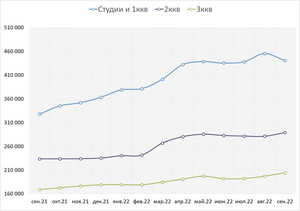 Цены предложения студий и однокомнатных квартир за месяц снизились на 2,36%, двухкомнатные квартиры подешевели на 2,51%, трехкомнатные – на 2,09%.