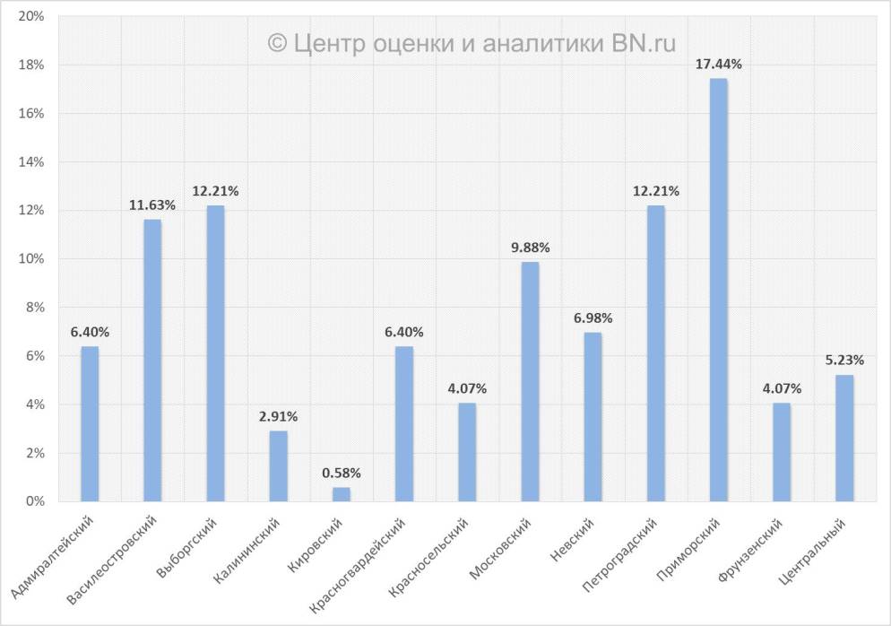 В структуре предложения по районам лидирующую позицию занимает Приморский район Петербурга – 17,4% от всего объема рынка новостроек. Далее на рынке квартир в строящихся домах большие доли занимают Василеостровский, Выборгский, Московский и Петроградский районы: предложение в них составляет 11,6%, 12,2%, 9,9% и 12,2% от всего объема рынка новостроек. Минимальное количество строительных объектов наблюдается в Калининском, Кировском и Фрунзенском районах – 2,9%, 0,6% и 4,1% соответственно.