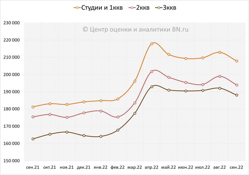 Цены предложения студий и однокомнатных квартир за месяц снизились на 2,36%, двухкомнатные квартиры подешевели на 2,51%, трехкомнатные – на 2,09%.