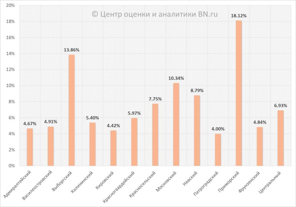 В структуре предложения по районам лидирующую позицию занимает Приморский район Петербурга – 17,4% от всего объема рынка новостроек. Далее на рынке квартир в строящихся домах большие доли занимают Василеостровский, Выборгский, Московский и Петроградский районы: предложение в них составляет 11,6%, 12,2%, 9,9% и 12,2% от всего объема рынка новостроек. Минимальное количество строительных объектов наблюдается в Калининском, Кировском и Фрунзенском районах – 2,9%, 0,6% и 4,1% соответственно.