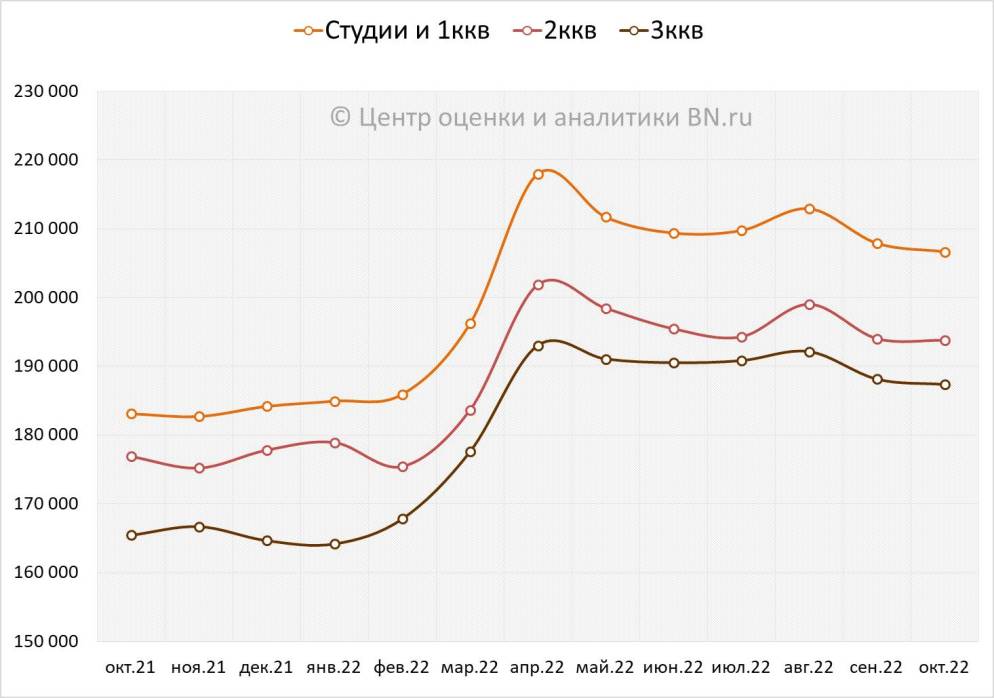 Цены предложения студий и однокомнатных квартир за месяц снизились на 0,6%, двухкомнатные квартиры подешевели на 0,13%, трехкомнатные – на 0,42%.