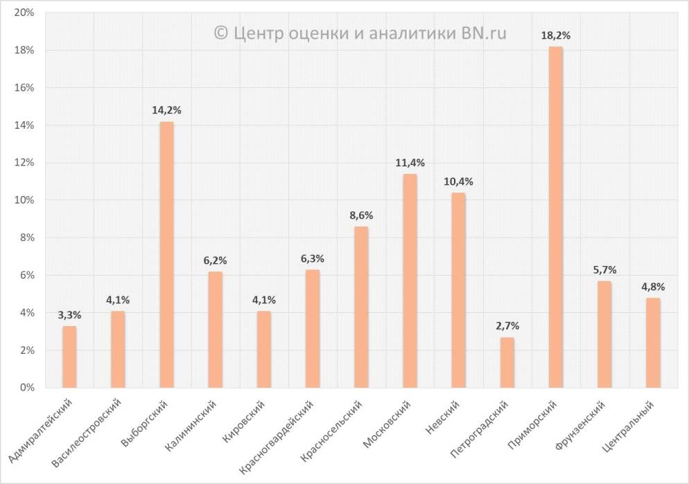 В структуре предложения по районам на конец месяца лидирующую позицию занимает Приморский район – 18,2% от объема выставленных на продажу квартир. Далее на вторичном рынке жилья большие доли занимают Выборгский, Московский и Невский районы: предложение в них составляет 14,2%, 11,4% и 10,4% соответственно. Минимальные доли составляет предложение в Адмиралтейском, Василеостровском, Кировском, Петроградском и Фрунзенском районах – 3,3%, 4,1%, 4,1%, 2,7% и 4,8% соответственно от общего объема выставленных на продажу квартир.