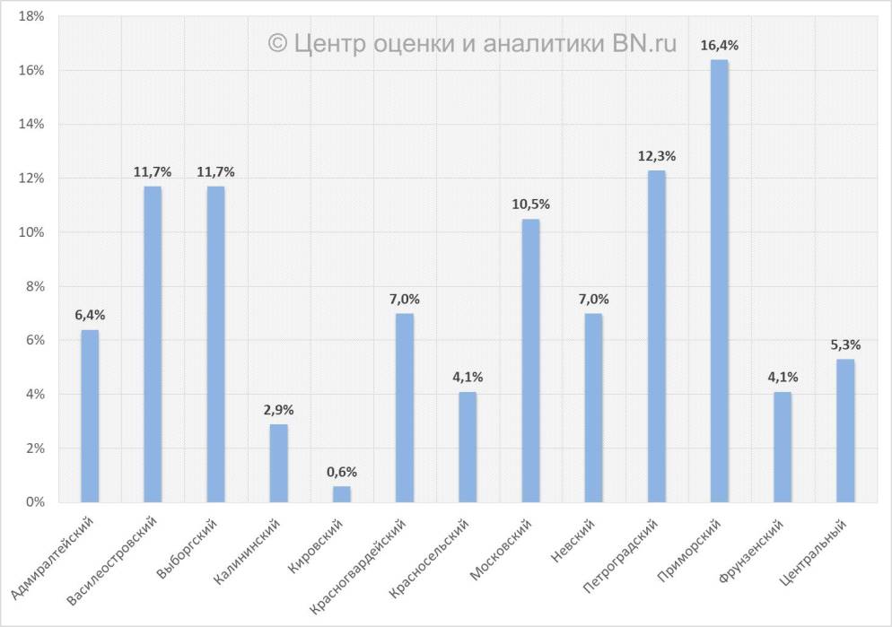 В структуре предложения по районам лидирующую позицию занимает Приморский район Петербурга – 16,4% от всего объема рынка новостроек. Далее на рынке квартир в строящихся домах большие доли занимают Василеостровский, Выборгский, Московский и Петроградский районы: предложение в них составляет 11,6%, 11,7%, 10,5% и 12,3% от всего объема рынка новостроек. Минимальное количество строительных объектов наблюдается в Калининском и Кировском районах – 2,9% и 0,6% соответственно.