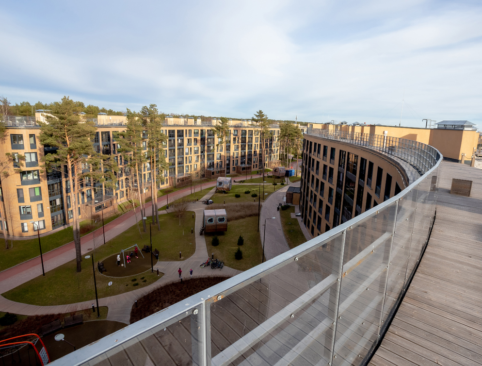 Идея гармонии с природой нашла отражение во всех деталях и благоустройстве. К примеру, крыши всех корпусов – с эксплуатируемой кровлей, на них обустроены видовые площадки с использованием террасной доски и морской гальки.