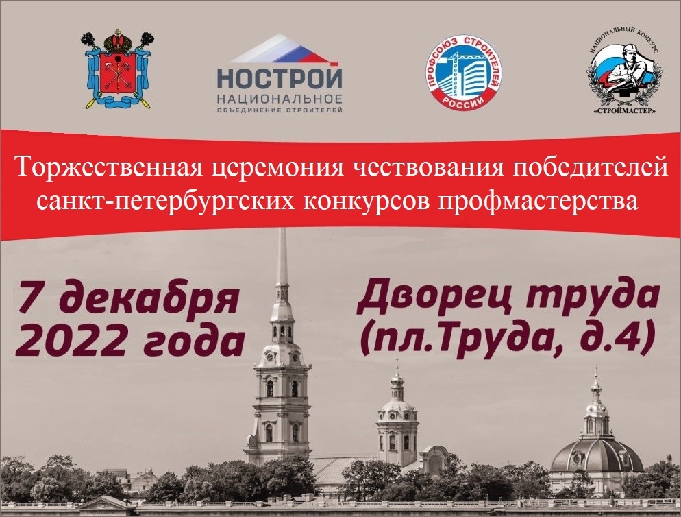 По инициативе Ассоциации «Национальное объединение строителей» и при поддержке Комитета по строительству Правительства Санкт-Петербурга, а также профсоюза строителей Санкт-Петербурга и Ленинградской области 7 декабря в 16:00 во Дворце труда будут чествовать лучших специалистов строительных профессий, организаций, руководителей строительных компаний.