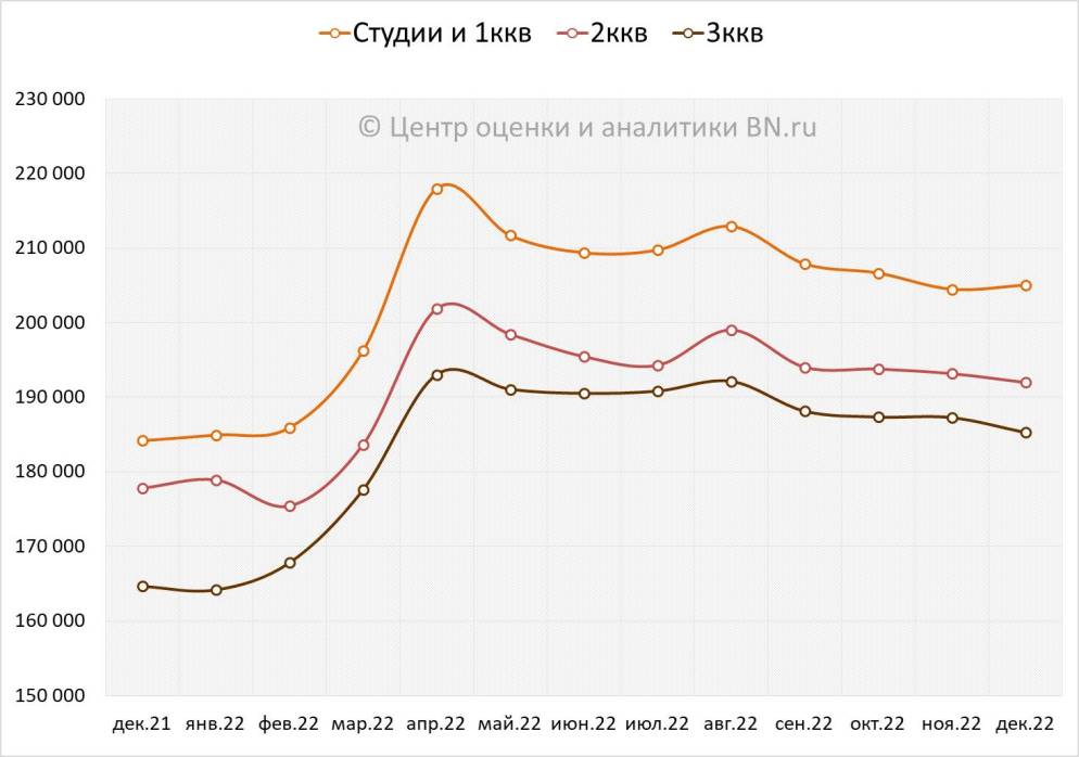 Цены предложения студий и однокомнатных квартир за месяц поднялись на 0,27%, двухкомнатные квартиры подешевели на 0,61%, трехкомнатные квартиры – на 1,07%.