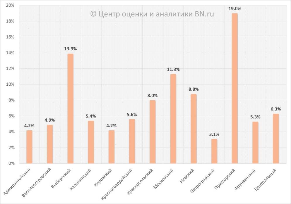 В структуре предложения по районам на конец месяца лидирующую позицию занимает Приморский район – 19,0% от объема выставленных на продажу квартир. Далее на вторичном рынке жилья большие доли занимают Выборгский, Московский и Невский районы, предложение в них составляет 13,9%, 11,3% и 8,8% соответственно. Минимальные доли составляет предложение в Адмиралтейском, Василеостровском, Кировском и Петроградском районах – 4,2%, 4,9%, 4,2% и 3,1% соответственно от общего объема выставленных на продажу квартир.