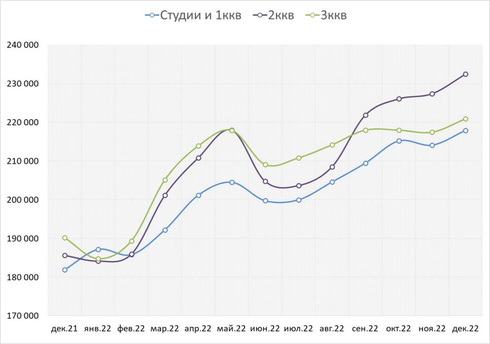 Цены предложения студий и однокомнатных квартир повысились на 1,79%, двухкомнатные квартиры подорожали на 2,23%, трехкомнатные подорожали на 1,59%.