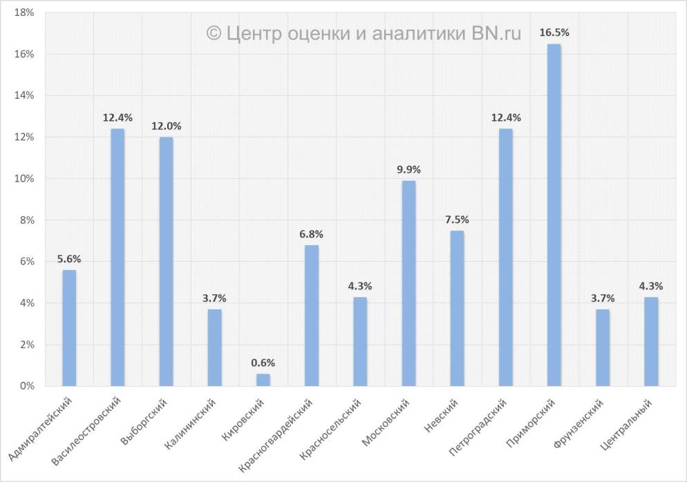 В структуре предложения по районам лидирующую позицию занимает Приморский район Петербурга – 16,5% от всего объема рынка новостроек. Далее на рынке квартир в строящихся домах большие доли занимают Василеостровский, Выборгский, Московский и Петроградский районы, предложение в них составляет 12,4%, 12,0%, 9,9% и 12,4% от всего объема рынка новостроек. Минимальное количество строительных объектов наблюдается в Калининском, Кировском и Фрунзенском районах – 3,7%, 0,6% и 3,7% соответственно.