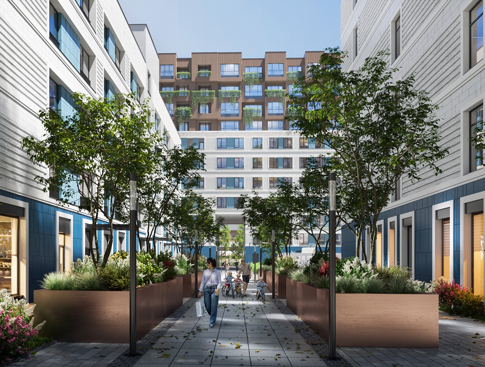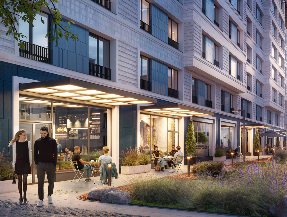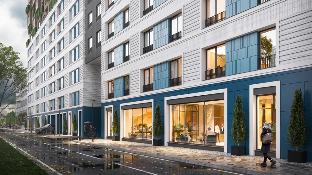 Квартал будет обеспечен и собственной инфраструктурой. Первые этажи домов займет современный ретейл с витражным остеклением.
