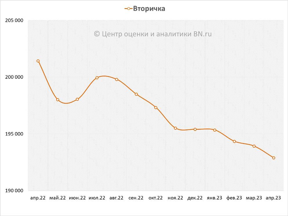 По данным Центра аналитики BN.ru, средняя цена предложения на вторичном рынке типового жилья в рублевом эквиваленте составила -0,53%, это -1 035 руб. с кв. м. Показатель средней цены предложения к концу апреля 2023 года – 192,9 тыс. руб. за кв. м.