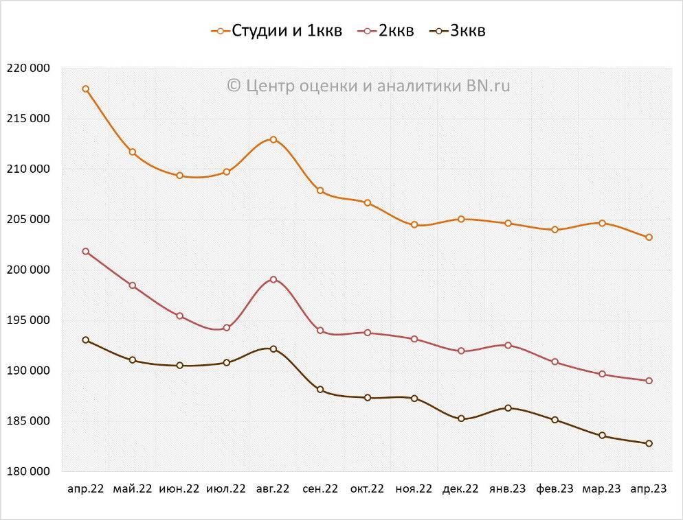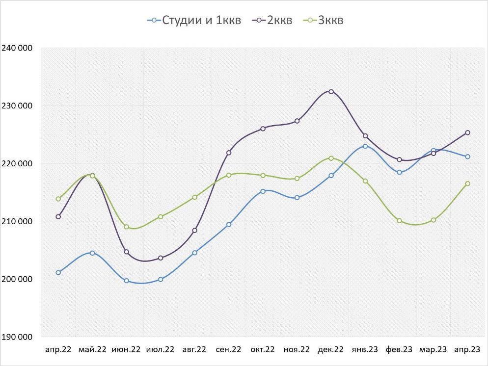 Цены предложения студий и однокомнатных квартир за месяц снизились на 0,69%, двухкомнатные квартиры подешевели на 0,34%, трехкомнатные квартиры – на 0,43%.