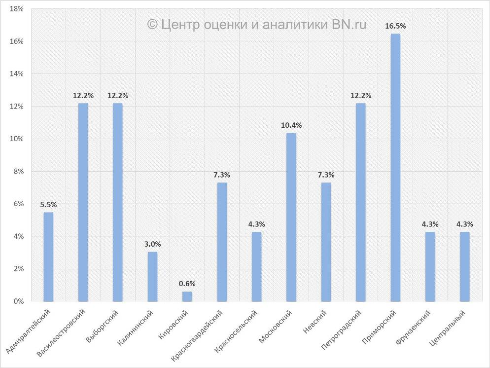 В структуре предложения по районам на конец месяца лидирующую позицию занимал Приморский район – 19,5% от объема выставленных на продажу квартир. Далее на вторичном рынке жилья существенные доли занимали Выборгский, Московский и Невский районы, предложение в них составляло 11,6%, 10,3% и 9,3% соответственно. Минимальные доли составляло предложение в Адмиралтейском, Василеостровском, Кировском и Петроградском районах – 4,3%, 4,9%, 4,3% и 3,6% соответственно от общего объема выставленных на продажу квартир.