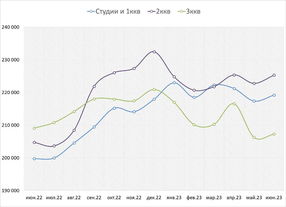 Средние цены предложения студий и однокомнатных квартир на конец месяца составили 6,8 млн руб., двухкомнатных – 11,0 млн руб., трехкомнатных – 14,6 млн руб.