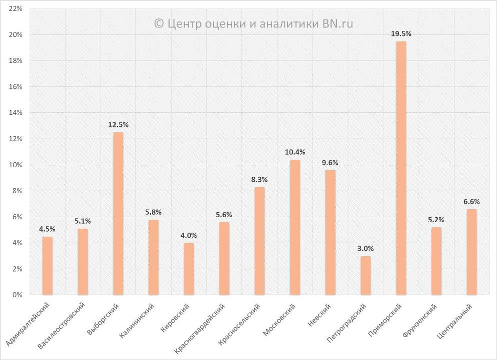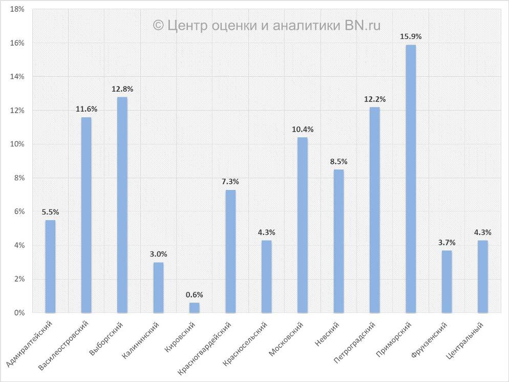 Структура предложения по районам Петербурга, % от общего объема