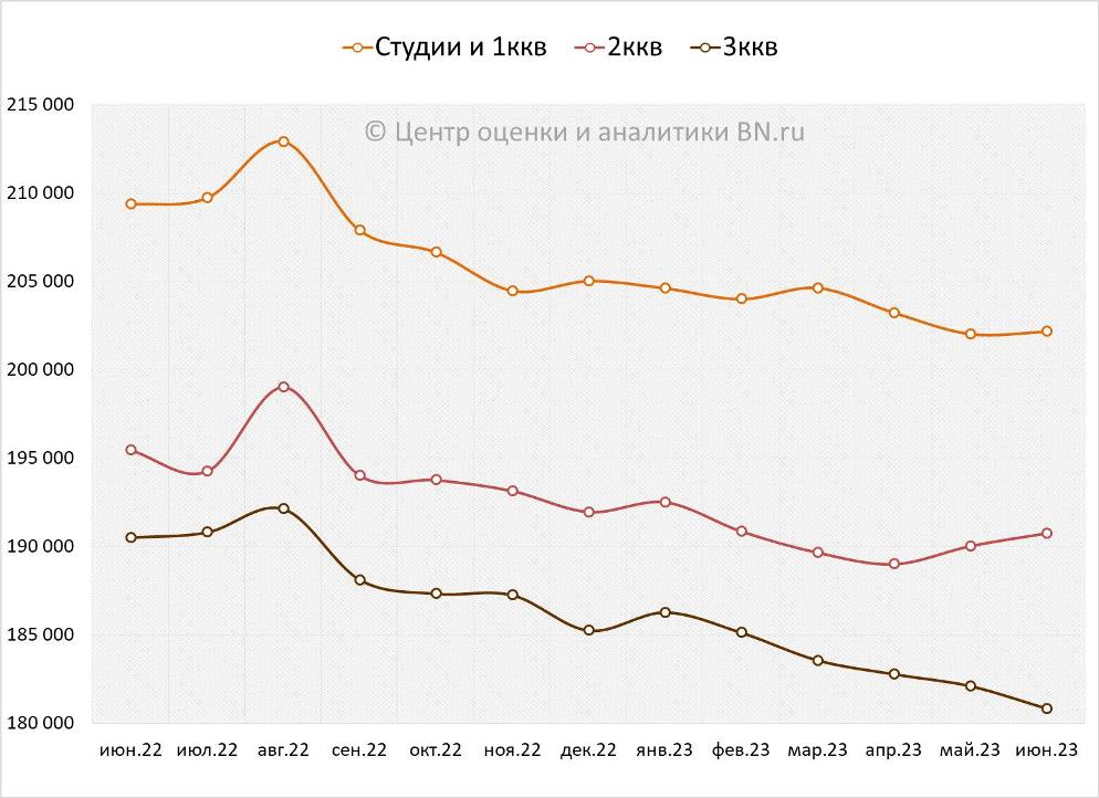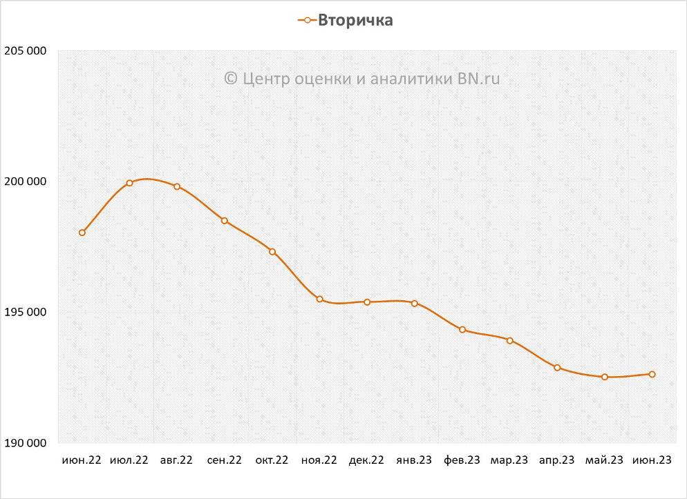 По данным Центра оценки и аналитики BN.ru, средняя цена предложения на вторичном рынке типового жилья в рублевом эквиваленте составило 0,06%, это -111 руб. с кв. м. Показатель средней цены предложения к концу июня 2023 года – 192,6 тыс. руб. за кв. м.