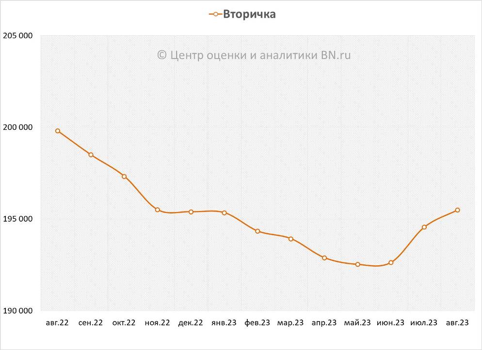 По данным Центра оценки и аналитики BN.ru, изменение средней цены предложения на вторичном рынке типового жилья в рублевом эквиваленте составило 0,48%, это 935 руб. с кв. м. Показатель средней цены предложения к концу августа 2023 года – 195,5 тыс. руб. за кв. м.