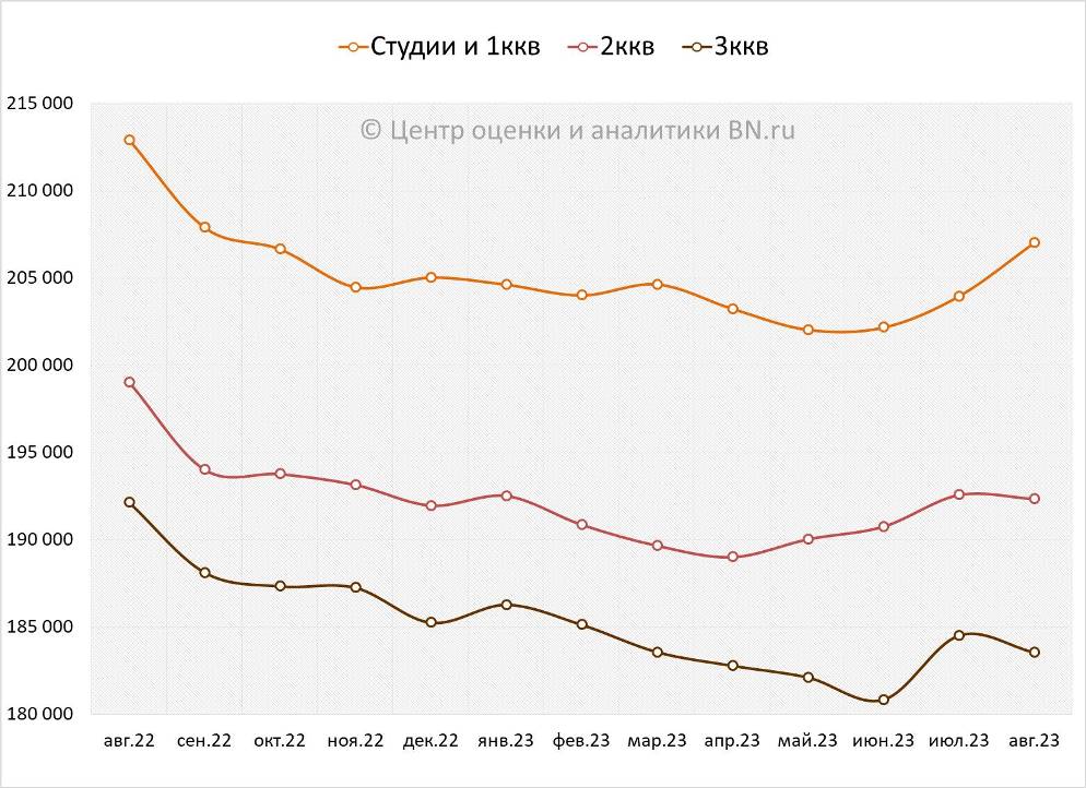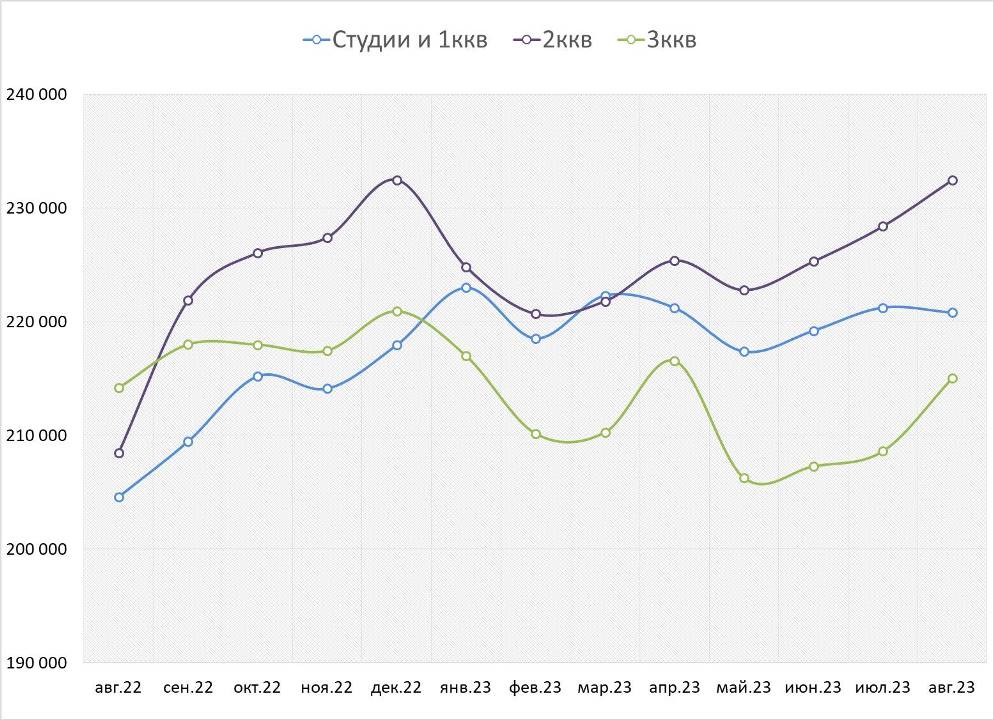 Цены предложения студий и однокомнатных квартир снизились на незначительные 0,2%, двухкомнатные квартиры подорожали на 1,78%. Цены на трехкомнатные выросли на 3,08%.
