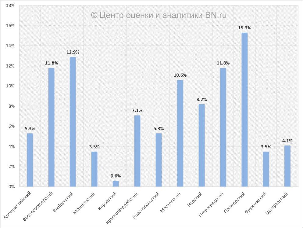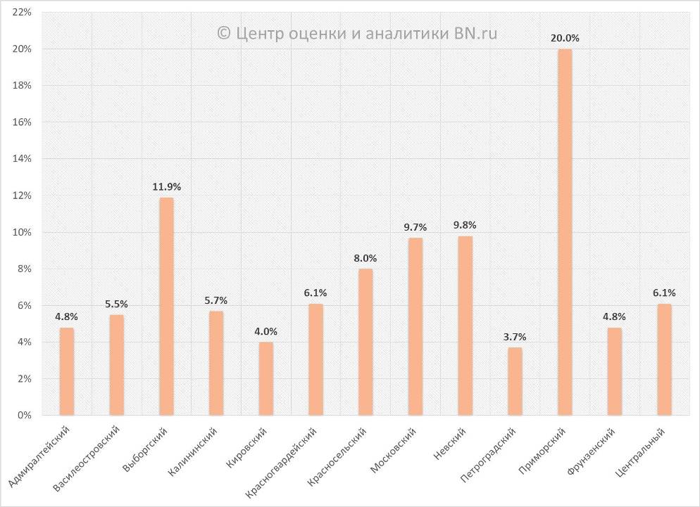 В структуре предложения по районам на конец месяца лидирующую позицию занимал Приморский район – 20,0% от объема выставленных на продажу квартир. Далее на вторичном рынке жилья существенные доли занимали Выборгский, Московский и Невский районы, предложение в них составляло 11,9%, 9,7% и 9,8% соответственно. Минимальные доли составляло предложение в Адмиралтейском, Кировском и Петроградском районах – 4,8%, 4,0% и 3,7% соответственно от общего объема выставленных на продажу квартир.