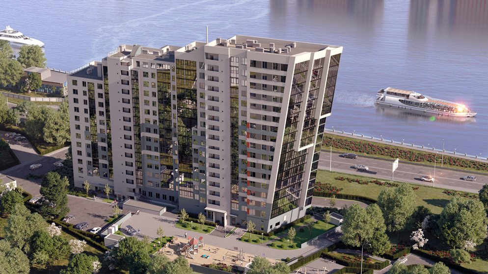 Комплекс комфорт-класса строится в историческом районе Русановка, на правом берегу Невы, неподалеку от Речного вокзала. Любые проекты на набережных требуют максимальной отдачи от девелопера – нужно органично вписать новостройку в невские ландшафты. Архитекторы из бюро Futura Architects сделали это за счет «морских» акцентов и деталей: ступенчатый силуэт здания из-за переменной этажности и наклонного торцевого фасада похож на большой круизный лайнер. В той же теме отделка фасадов: тонкослойная штукатурка белого, серо-голубого, серо-коричневого цветов, красно-коричневые акценты, а также металлические декоративные элементы усиливают «корабельные» мотивы.