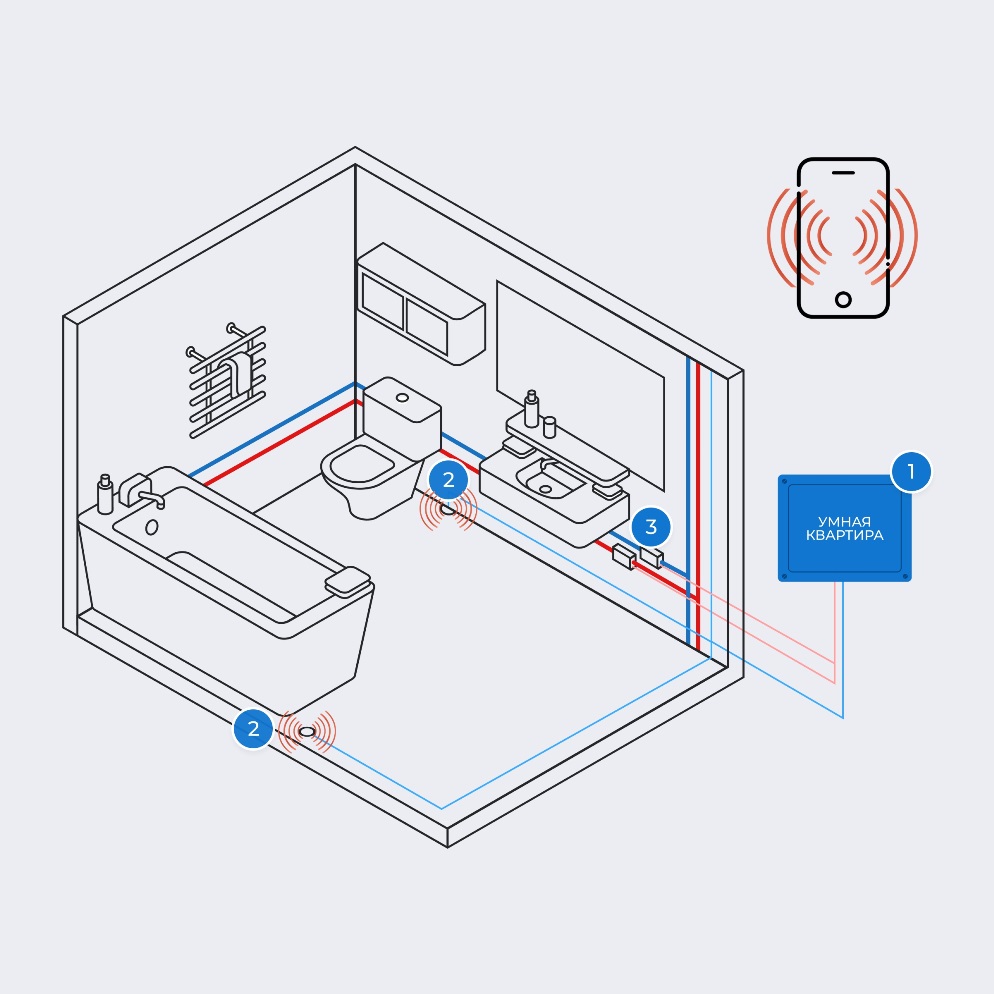 Датчики протечек в мокрых зонах квартиры фиксируют аварии в системе водоснабжения и моментально перекрывают подачу воды, уведомляя об этом жителя