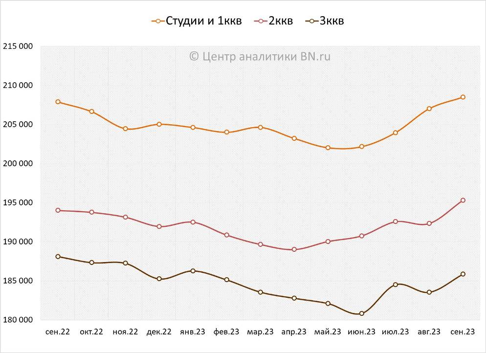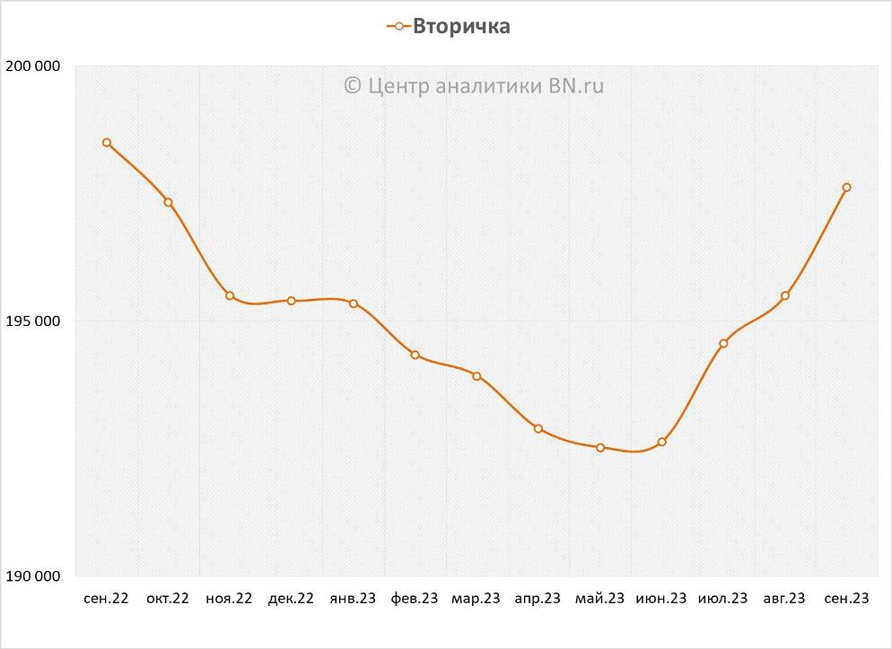 По данным Центра аналитики BN.ru, изменение средней цены предложения на вторичном рынке типового жилья в рублевом эквиваленте составило 1,1%, это 2 123 руб. с кв. м. Показатель средней цены предложения к концу сентября 2023 года – 197,6 тыс. руб. за кв. м.