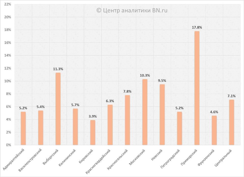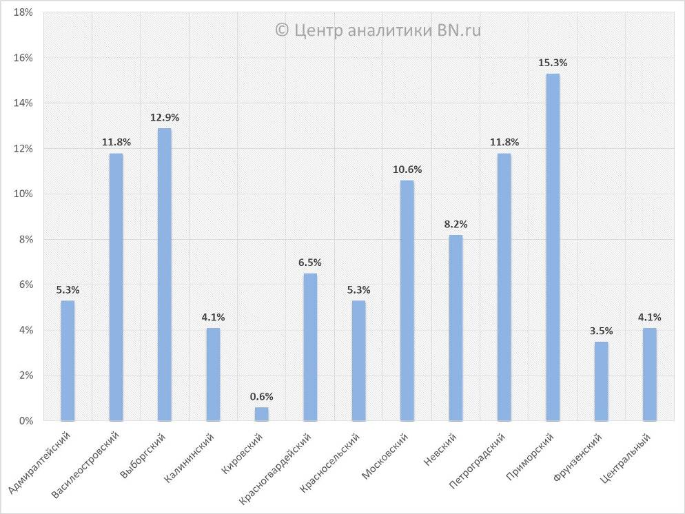 В структуре предложения по традиционным городским районам лидирующую позицию, по обыкновению, занимал Приморский район Петербурга – 15,3% от всего объема рынка новостроек. Далее на рынке квартир в строящихся домах большие доли занимали Василеостровский, Выборгский, Московский и Петроградский районы, предложение в них составляло 11,8%, 12,9%, 10,6% и 11,8% от всего объема рынка новостроек. Минимальное количество строительных объектов наблюдалось в Кировском и Фрунзенском районах – 0,6% и 3,5% соответственно.