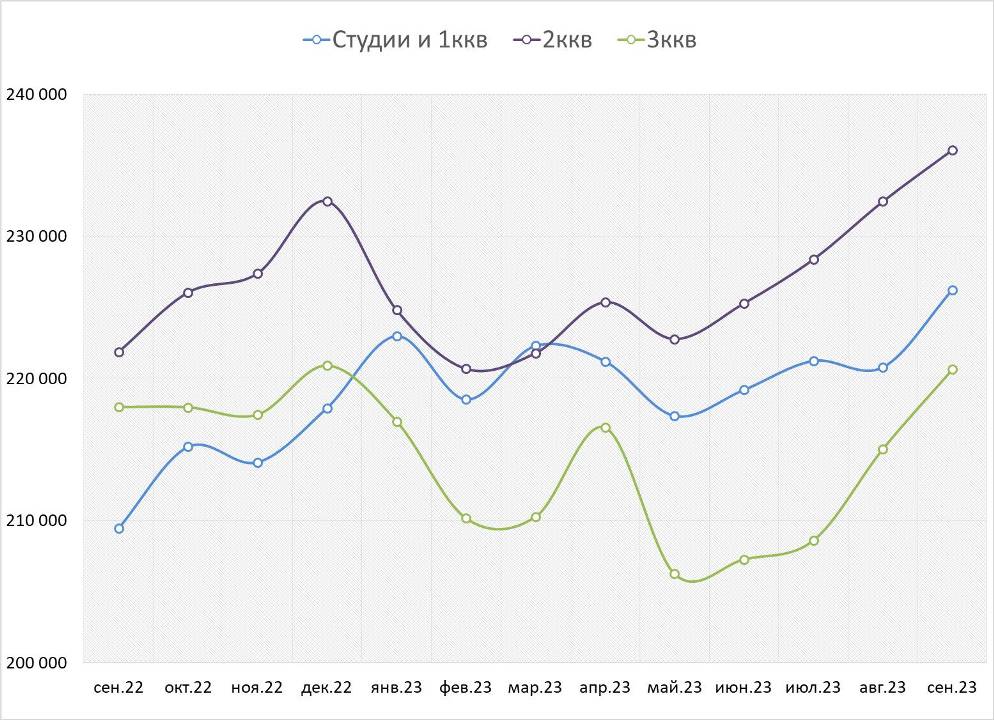 | Тип квартиры | Цена | Август 2023 | Сентябрь 2023 | Изменение за месяц |