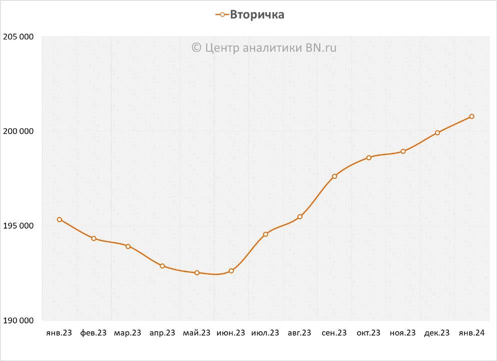 По подсчетам Центра аналитики BN.ru, средняя цена предложения на вторичном рынке жилья Санкт-Петербурга выросла в январе незначительно, на 0,4% (это 861 руб. за кв. м) и к началу февраля 2024 составила 200,8 тыс. руб. за кв. м.